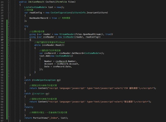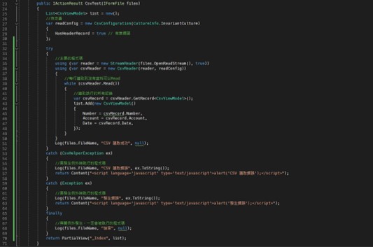 try區塊:負責讀取 CSV 並將取得的資料添加到列表中,詳細的做法可以參考「使用 CsvHelper 讀取 CSV 檔案」。