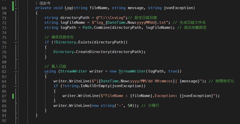 接下來,設定 Log 文件要建立的資料夾位置以及檔案名稱的格式。在確定目錄存在後,就可以開始寫入 Log 的內容,包含時間、傳入的 message 和 jsonException。最後,加上分隔線以區隔不同的 Log 內容,這樣就簡略地完成了 Log 的function如下圖所示: