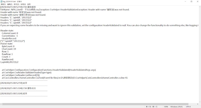 接下來,沿用部落格的一篇文章「使用 CsvHelper 讀取 CSV 檔案」中的範例,來實作try-catch-finally。